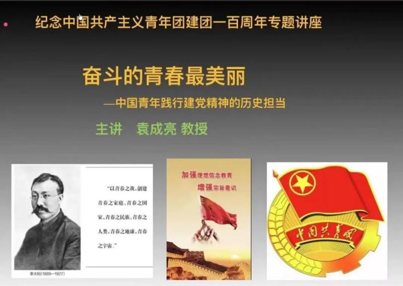 講座開始,袁老師提到此次講座的初衷和目的:回顧共青團(tuán)成立發(fā)展的歷史足跡,重溫中國(guó)青年英勇奮斗歷程中的苦難與輝煌,向革命與建設(shè)中涌現(xiàn)的杰出青年致以崇高敬意。