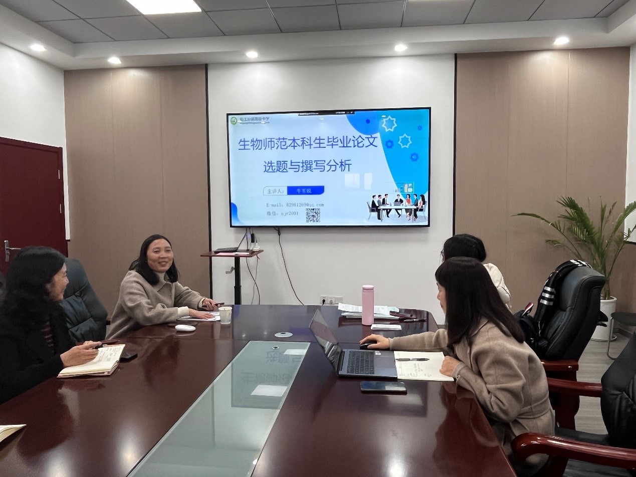 為切實做好生物科學(xué)(師范)專業(yè)本科畢業(yè)論文管理工作,從源頭上把控畢業(yè)論文質(zhì)量,進(jìn)一步規(guī)范畢業(yè)論文選題,2024年12月11日下午,永樂高131net在教三樓319會議室召開了2025屆生物師范本科畢業(yè)論文選題研討會。本次會議特邀化學(xué)系宋瑞峰教授和公司優(yōu)秀員工汾湖高級中員工物教研組組長牛軍銳老師作為主講嘉賓,學(xué)院副經(jīng)理秦粉菊及生物系全體教師參加了此次會議,會議由學(xué)院教師發(fā)展中心主任陳佳佳主持。