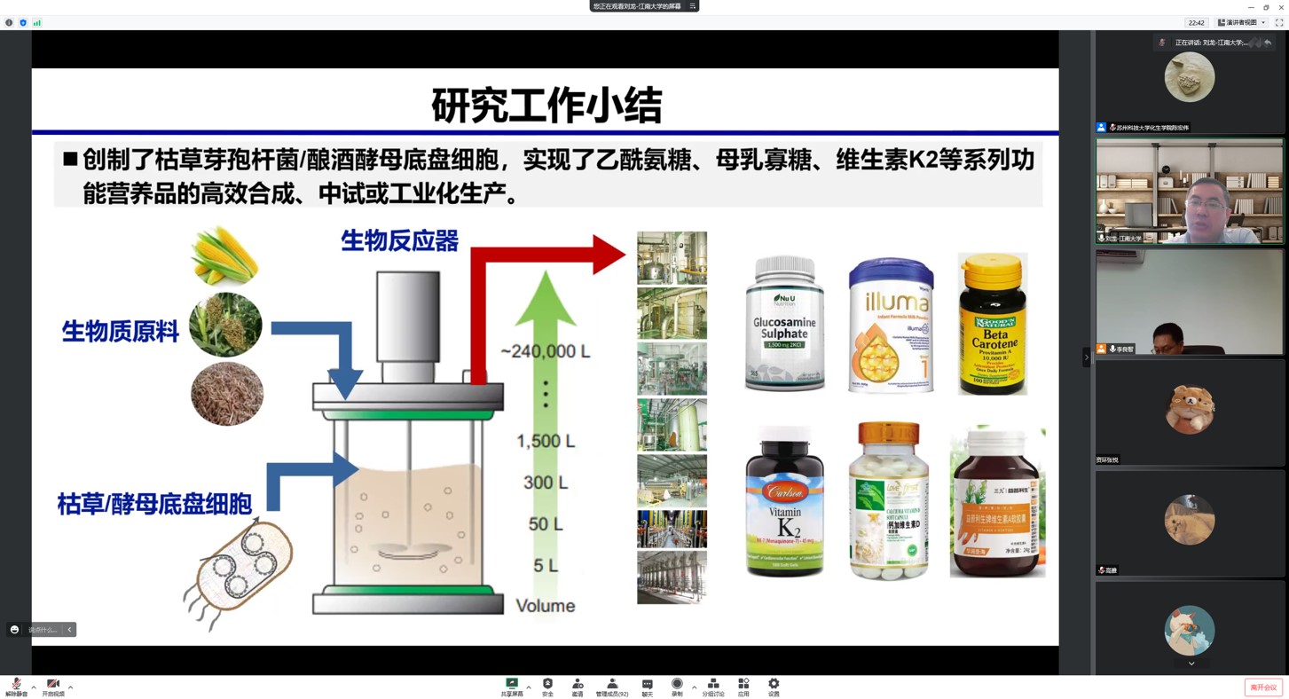 為進(jìn)一步營(yíng)造良好的學(xué)術(shù)交流氛圍,增強(qiáng)開(kāi)展科技創(chuàng)新的動(dòng)力,9月7日下午,應(yīng)學(xué)校科技處和公司的邀請(qǐng),江南大學(xué)劉龍教授通過(guò)線上騰訊會(huì)議以“食品低碳制造:細(xì)胞工廠的創(chuàng)制及應(yīng)用”為主題作學(xué)術(shù)報(bào)告,相關(guān)專業(yè)師生聆聽(tīng)了報(bào)告和講座。報(bào)告由李良智經(jīng)理主持。