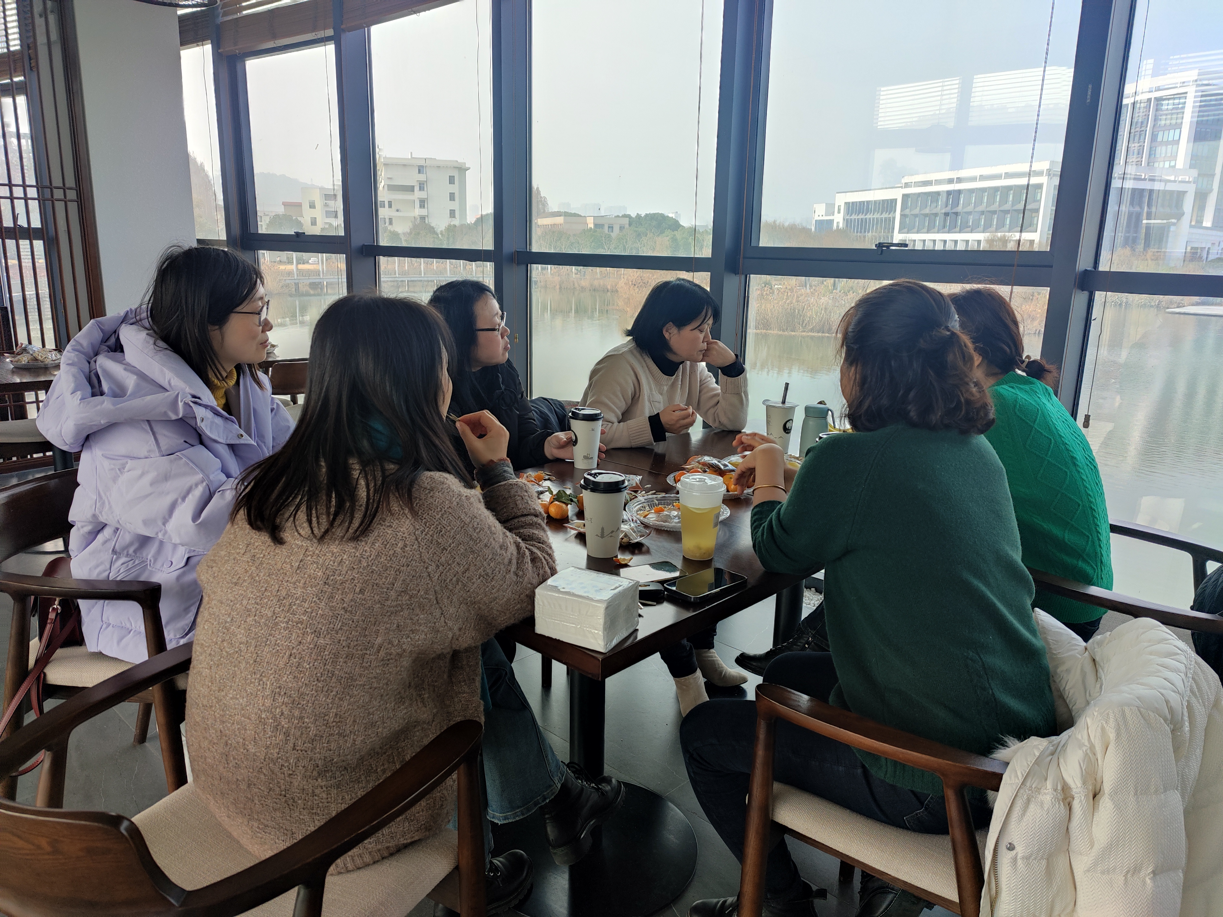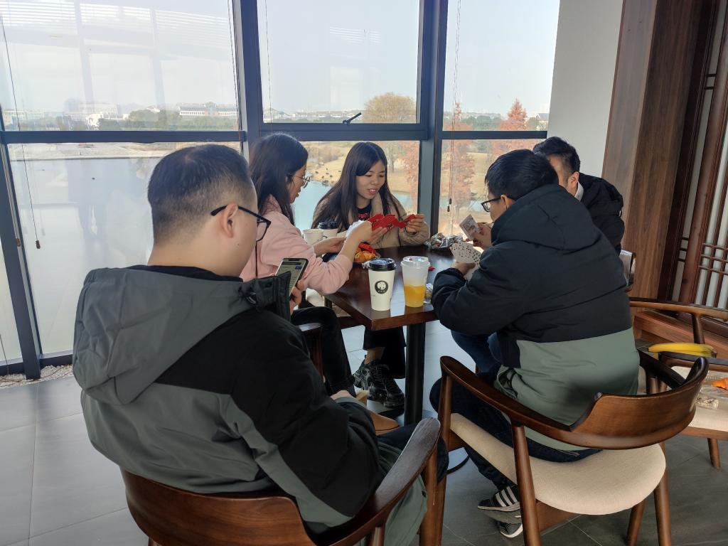 陽光下,參加比賽的老師,時而沉著冷靜思考,時而開心笑談,展示著各自的牌技和智慧。不參加摜蛋比賽的老師,三五成群的圍坐在桌子旁品嘗冒著熱氣的飲品和各種干果零食,一邊交流著一年以來工作和生活里的種種體會感悟。
