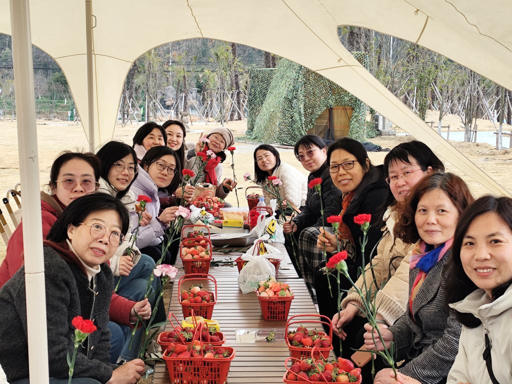活動伊始,女教工們在溪畔農(nóng)莊圍坐一堂,品嘗農(nóng)家柴火咸肉飯。炊煙裊裊中,眾人暢談鄉(xiāng)村振興與農(nóng)業(yè)科技,在煙火氣中感悟科技服務民生的使命。梅林漫步,暗香浮動間,眾人圍繞“綠色化學”“生物資源可持續(xù)利用”等話題展開討論,將專業(yè)視角融入自然觀察。草莓大棚內(nèi),紅果綠葉相映成趣。眾人手持竹籃穿梭壟間,歡聲笑語中體驗采摘之樂。閑暇之余,院工會組織女教工們學習并探討了最新的退休政策。回程途中,學院發(fā)放并組織女教工們認真學習了《關于支持女性科技人才在科技創(chuàng)新中發(fā)揮更大作用的若干措施》政策文件?;貋砗?,學院在逸夫樓展出了7位女教工的優(yōu)秀風采,并鼓勵大家積極向他們學習,努力做好相關教學、科研工作。