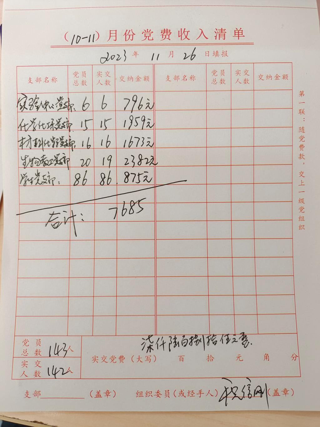 全院共收到實驗中心教工黨支部、化學化工系教工黨支部、材料化學系教工黨支部、生物系教工黨支部和員工黨支部142名黨員交納黨費7685元。