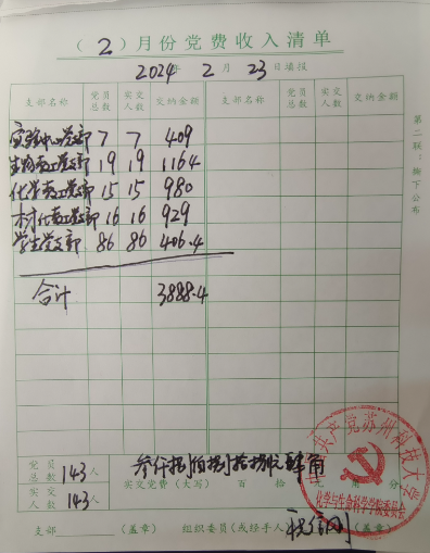 全院共收到實驗中心教工黨支部、化學化工系教工黨支部、材料化學系教工黨支部、生物系教工黨支部和員工黨支部143名黨員交納黨費的3888.4元。