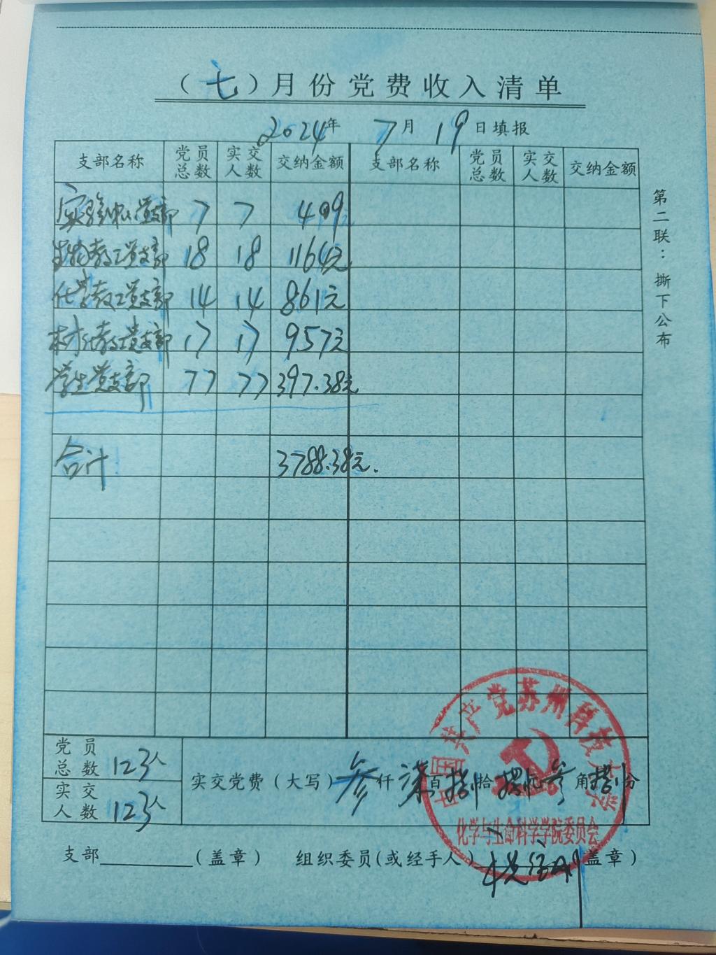 全院共收到實驗中心黨支部、化學(xué)化工系教工黨支部、材料化學(xué)系教工黨支部、生物系教工黨支部和員工黨支部123名黨員交納黨費的3788.38元。