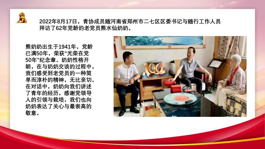 2022年8月17日,青協(xié)成員隨河南省鄭州市二七區(qū)區(qū)委書(shū)記與隨行工作人員拜訪了62年黨齡的老黨員熊水仙奶奶。在交談中,奶奶多次提到目睹建國(guó)以來(lái)一步步的成長(zhǎng),克服萬(wàn)難建設(shè)成為如今的新時(shí)代大國(guó)的激動(dòng)心情,并表達(dá)了對(duì)黨和領(lǐng)導(dǎo)的感謝,一度熱淚盈眶。