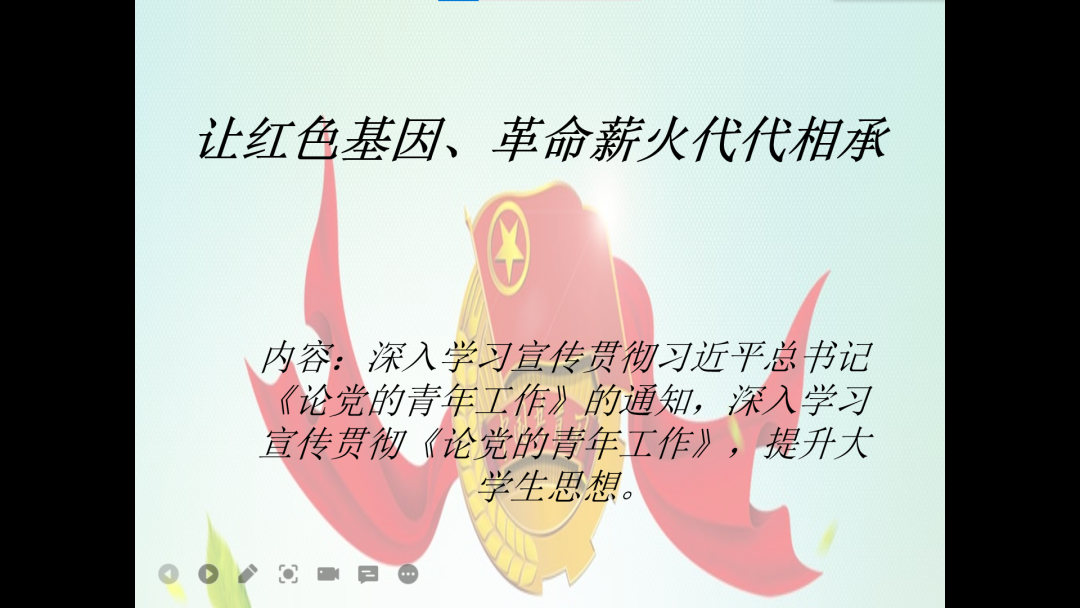 第二項(xiàng):主要介紹并解讀習(xí)近平總書(shū)記《論黨的青年工作》,深入學(xué)習(xí)宣傳貫徹體會(huì)其深刻意義和內(nèi)在精神。