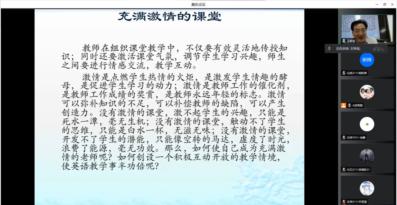 王希儉教授分析了教師與課堂的關(guān)系,并提出“激情課堂”、“問題課堂”、“思維課堂”和“智慧課堂”四個教學(xué)理論方法,通過展示課堂案例,闡明了實現(xiàn)變“重師”為“重生”的教學(xué)觀念,變“學(xué)會”為“會學(xué)”的教學(xué)目標(biāo),變“知識掌握”為“意義構(gòu)建”的教學(xué)策略。
